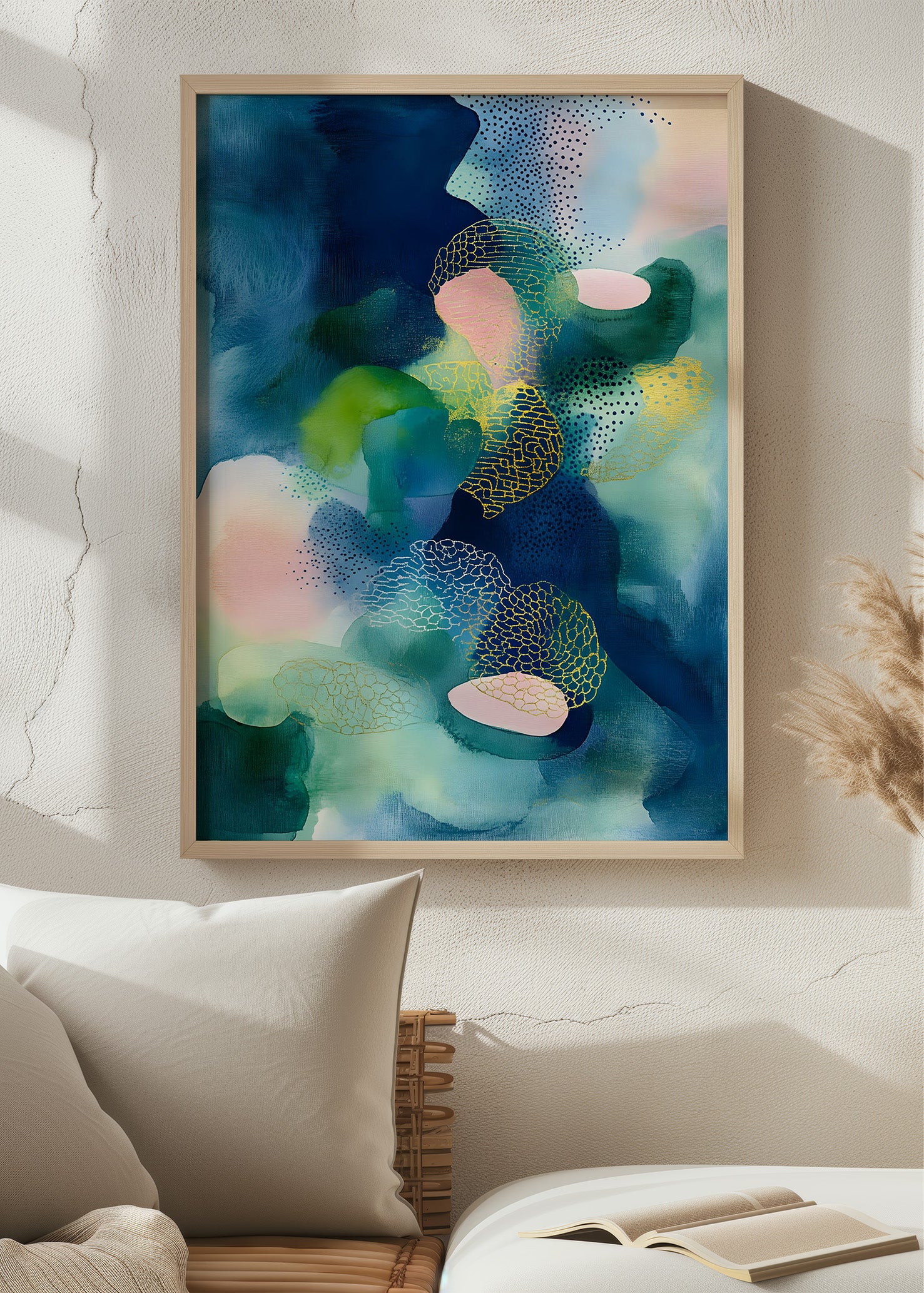 Coral Lover är en abstrakt poster med ett levande samspel mellan djupa blå toner, mjuka pasteller och organiska former. Lager av färg, struktur och grafiska detaljer skapar ett uttryck som känns både modernt och harmoniskt, med inspiration hämtad från naturens rörelser och koralliknande mönster. Postern passar perfekt som ett konstnärligt statement i vardagsrum, sovrum eller kreativa miljöer, och fungerar lika bra ensam som tillsammans med sin matchande del i serien för ett mer sammanhängande uttryck. Tryckt på högkvalitativt papper för en djup färgåtergivning och ett exklusivt intryck.