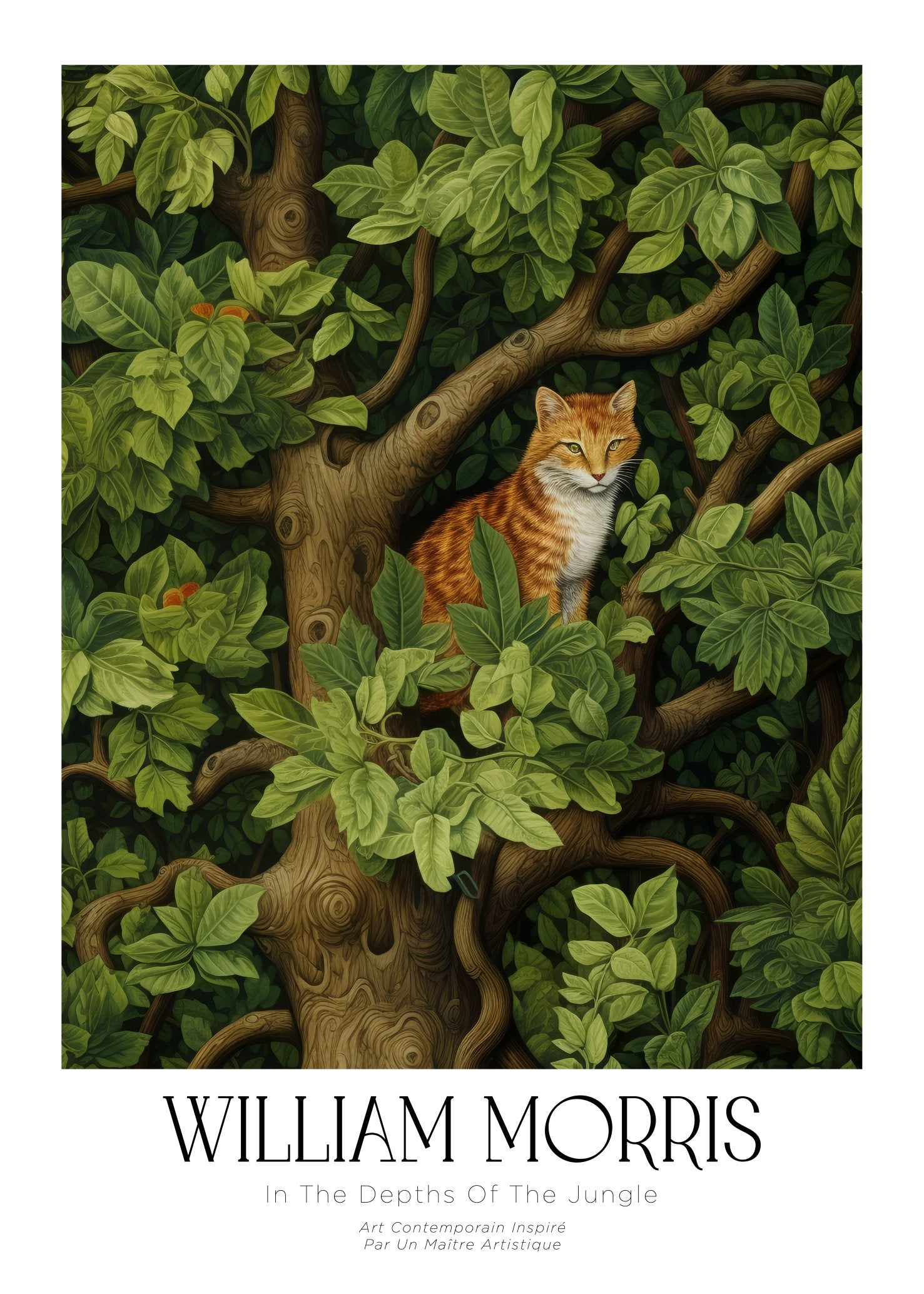 Inspired by William Morris – Cat Among the Leaves Poster förmedlar en stillsam närvaro mitt i naturens täta grönska, där varje detalj vittnar om harmoni och balans.