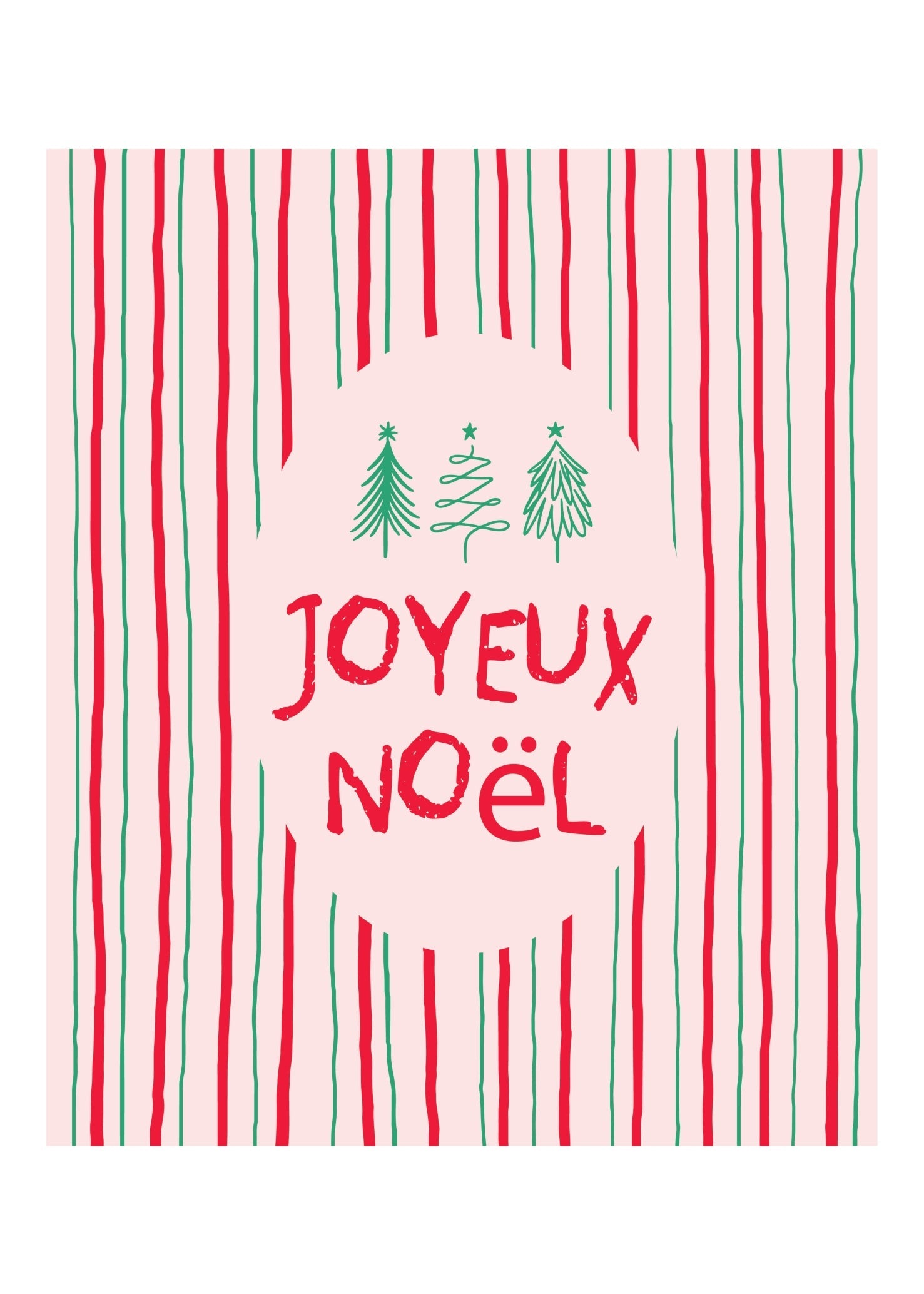 Sprid fransk julglans med Joyeux Noël Poster – en charmig design med röda och gröna handritade ränder och tre stiliserade julgranar. En perfekt kombination av lekfullhet och elegans som ger din julinredning en trendig, internationell touch.