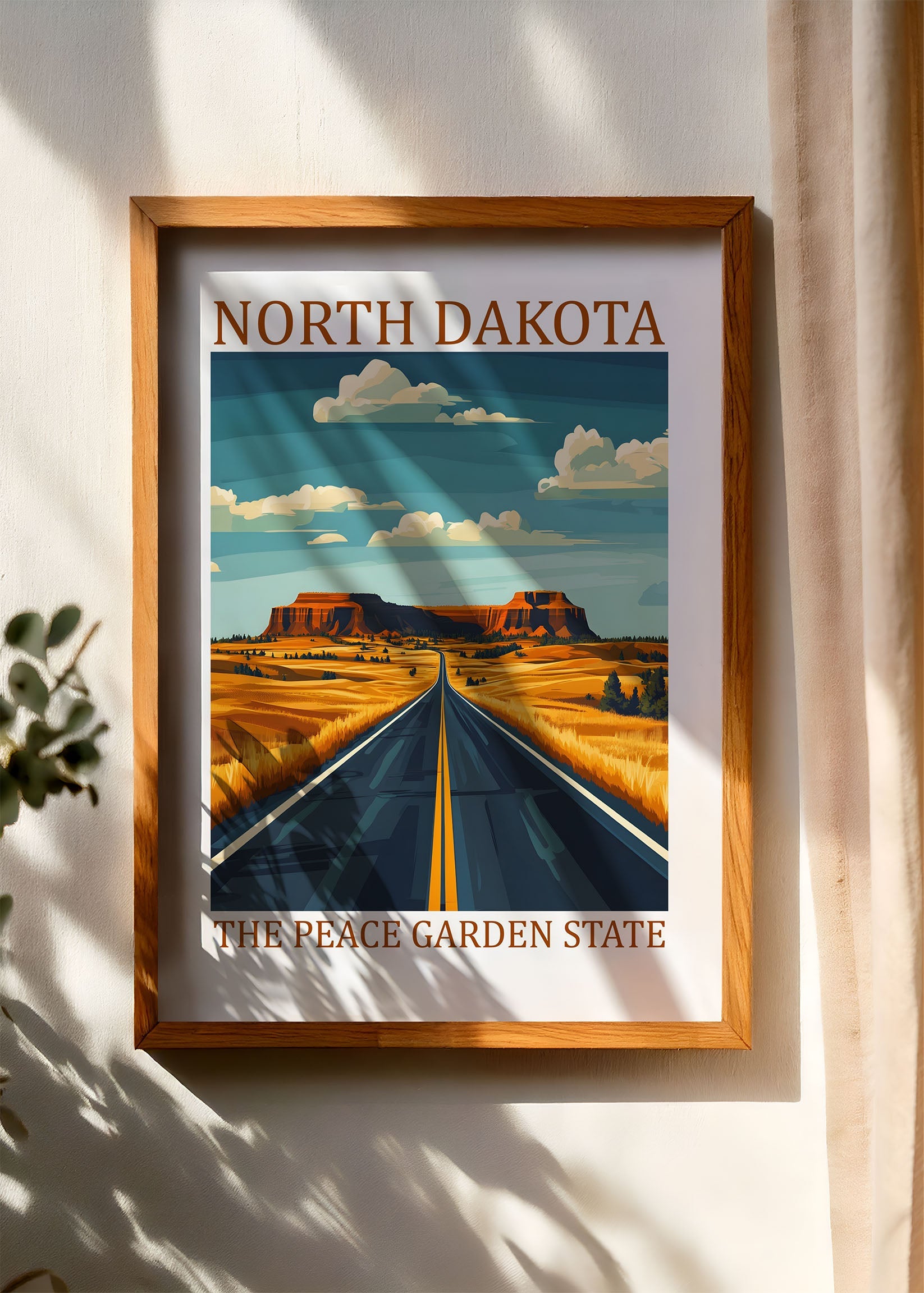 North Dakota – The Peace Garden State Poster förmedlar stillhet, vida fält och himmelens oändlighet. En hyllning till fred, balans och enkelhet.