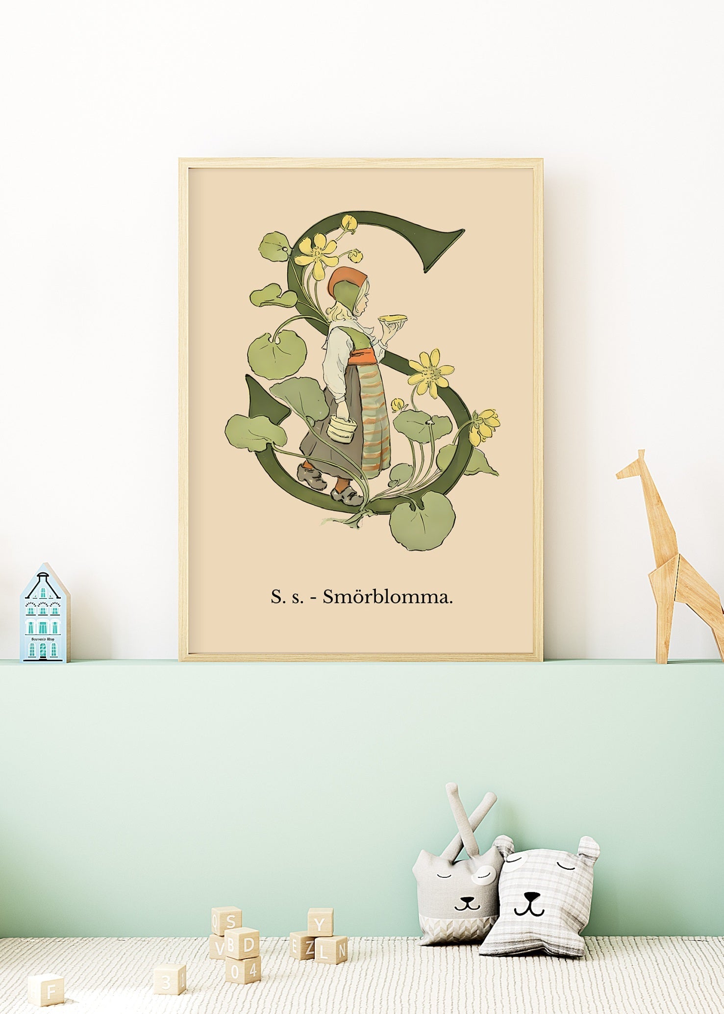 Prinsarnes Blomsteralfabet Poster är en hyllning till klassisk svensk konst och sagolik nostalgi. Serien är inspirerad av äldre illustrationer där varje bokstav representeras av en blomsterälva i mjuka
