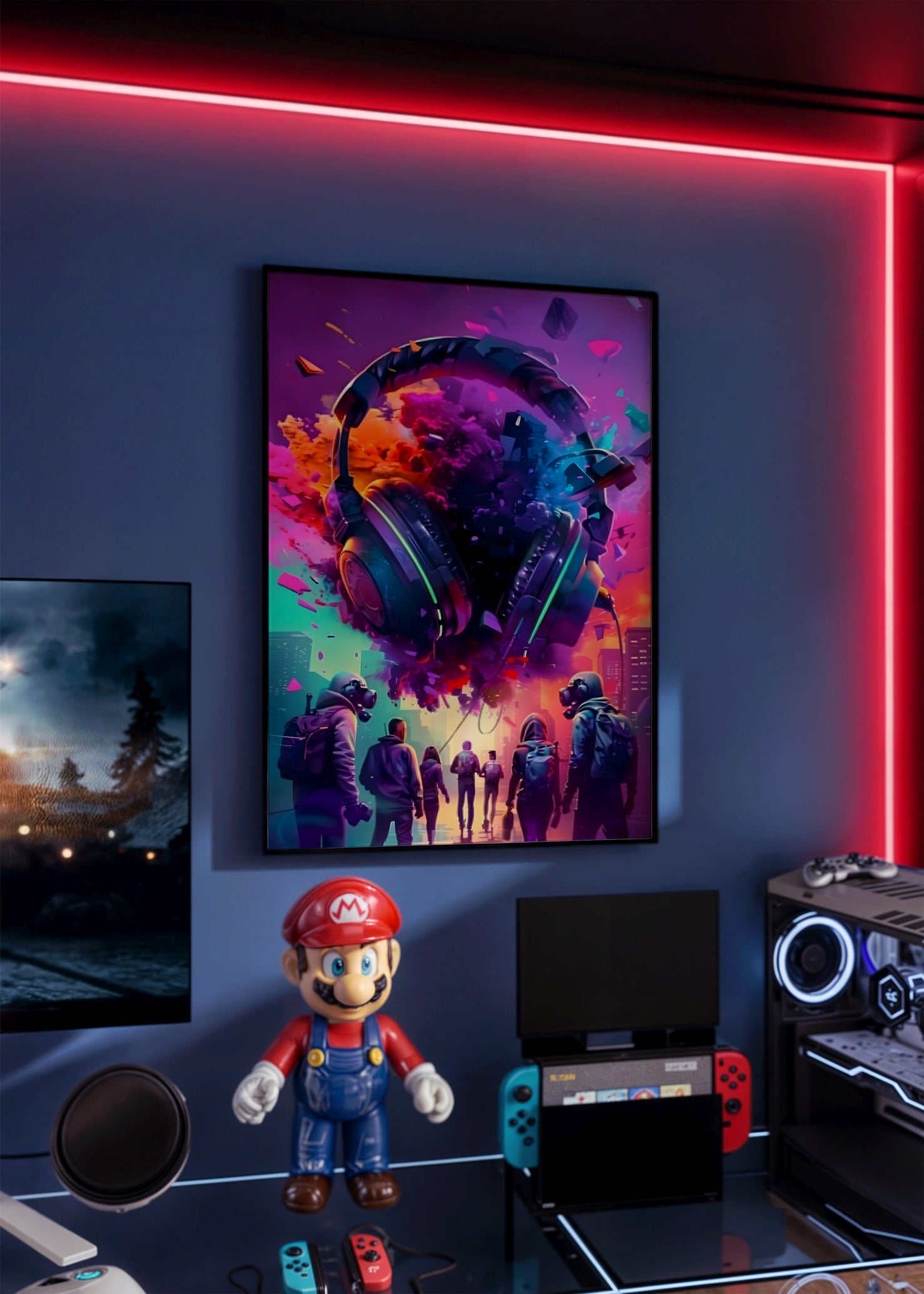 Soundwave Uprising Poster exploderar av färg, rytm och energi i ett motiv där ljudvågor förvandlas till kraft. Ett djärvt konstverk som andas musik, rörelse och futuristisk frihet.