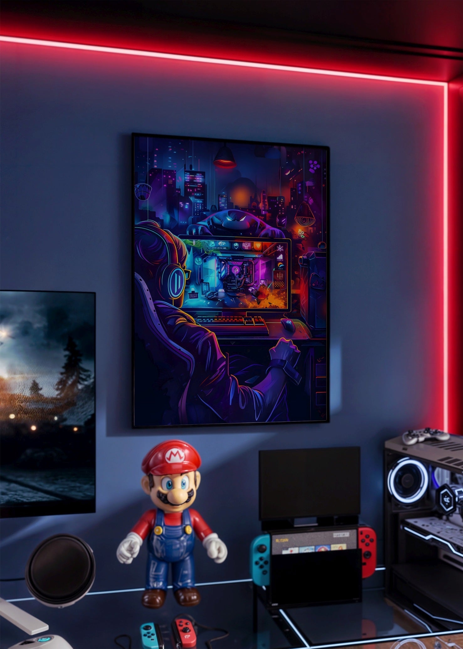 Techno Battle Poster pulserar av energi, med intensiva ljus och futuristisk estetik som fångar spelandets hjärta. En perfekt poster för den som lever för tävling, fokus och elektronisk passion.